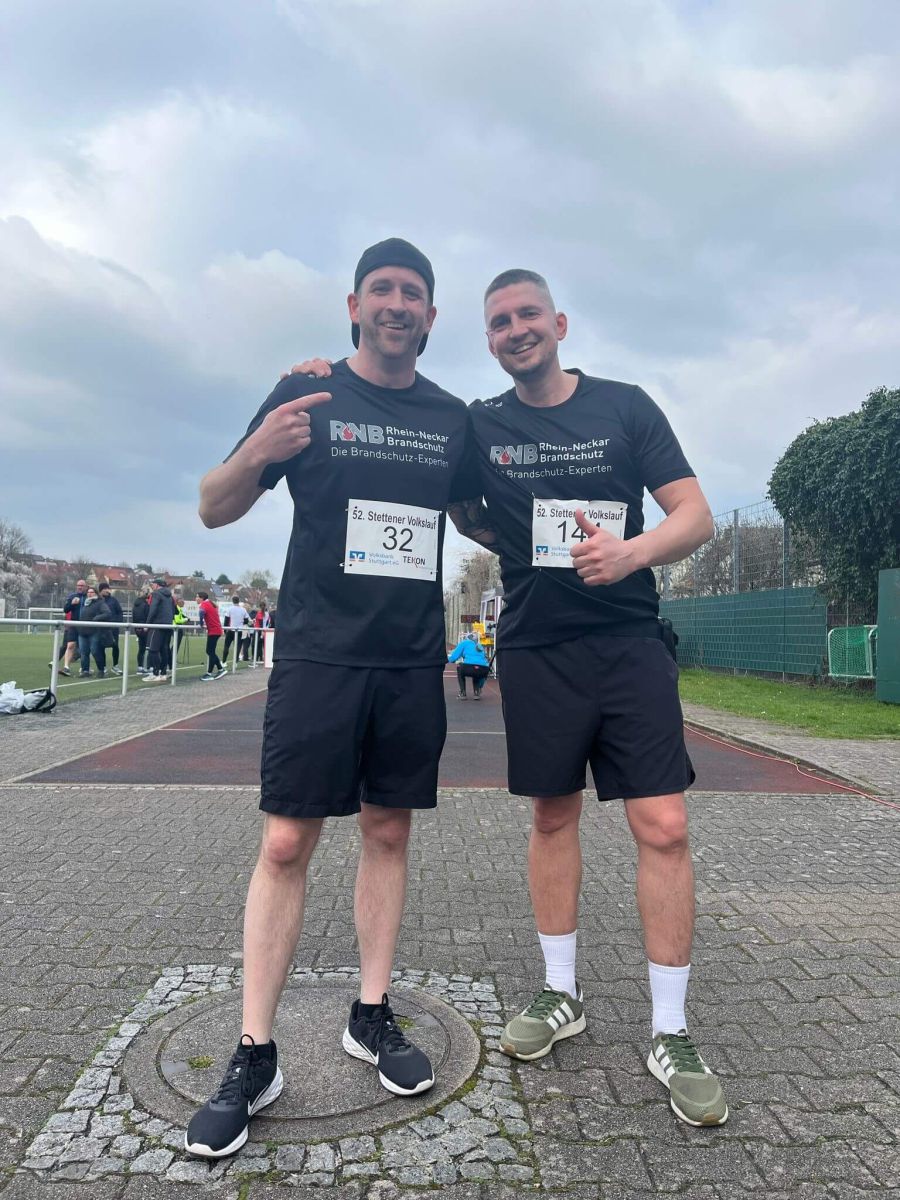 Wer sich da sportlich betätigt, so wie unsere beiden RNB-Mitarbeiter hier beim 10km-Lauf in Stetten am 29.03.2025, hält sich nicht nur körperlich fit, sondern hat dadurch auch im Arbeitsalltag einen klaren Wettbewerbsvorteil – wer rastet, der rostet.